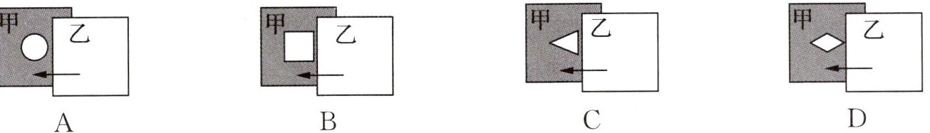 (4)为了研究孔的大小对光斑形状的影响,小明设计了四种有不同形状孔的卡片甲,并用另一张卡片乙覆盖在甲上,如图所示.接着,从图示位置水平向左移动乙,观察光斑形状的变化情况,下列合乎要求的是______.