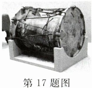 17. 亮点原创 如图所示是我国古代的羯鼓,南北朝时经西域传入,盛行于唐开元、天宝年间。鼓手敲击鼓面时,鼓声是由____振动产生的;若用更大的力敲击鼓面同一位置,鼓声的音调____(选填“变化”或“不变”,下同)、响度____、音色____。