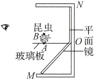 5. (2025·四川成都期末)如图所示是某同学用两块平面镜制作的昆虫观察箱,能同时观察到昆虫的腹部和背部,用A点表示昆虫的腹部,B点表示昆虫的背部,请你画出通过平面镜观察到的昆虫腹部、背部的像A'、B'.(忽略玻璃板的厚度)