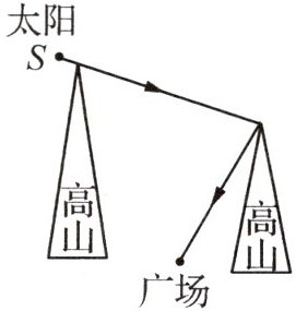 7. 新素养 科学思维 挪威的某小镇因为靠近北极且四面环山,每年有7个月照不到太阳.居民在高山上装了一面镜子,从而使阳光照到小镇广场上,光线路径如图所示,请在图中画出平面镜的位置.