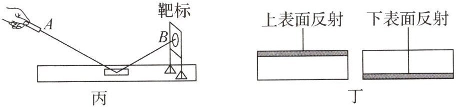 (4)平面镜分为上表面反射和下表面反射两种类型,如图丁所示.图丙中使用的是上表面反射镜,反射光到达靶标上形成一个亮斑.若其他条件不变,仅将平面镜改为下表面反射镜,亮斑的位置将____(选填"上移""不变"或"下移").
