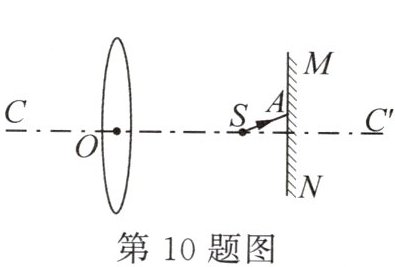 10.新素养科学思维(2025·江苏宿迁期中·1分)如图,平面镜MN垂直于凸透镜的主光轴CC',点光源S位于主光轴上,光线SA经平面镜反射和透镜折射后与主光轴平行.已知S到透镜光心和平面镜的距离分别是10cm、4cm,则此透镜的焦距是____cm.