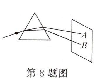 8.(3分)如图所示,一束太阳光通过三棱镜后发生偏折,射出的光射到白色光屏上,在AB间形成一条彩色光带,这是光的____现象,白色光屏上A处为____光.我们从各个方向都能看到彩色光带,是因为光在光屏上发生了____(选填"漫"或"镜面")反射.