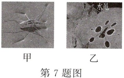 7.(2024·山东威海·2分)摄影爱好者拍摄到"站"在水面上的水黾(一种昆虫)纤细的腿使水面发生了形变,如图甲所示;同时看到水底有带"光环"的暗影,如图乙所示.此时"形变的水"相当于____(填光学元件名称);当水黾游到水浅的地方,暗影面积会____(选填"变小""不变"或"变大").