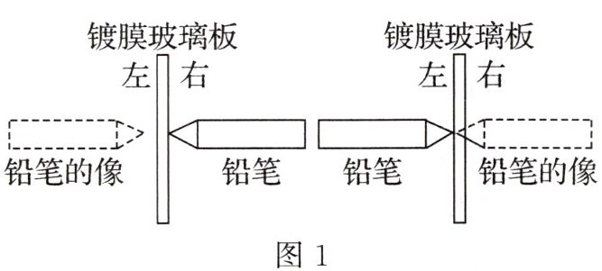 (10) 装置改进 完成上述实验后,小刚反思实验过程,提出一个质疑:实验中利用镀膜玻璃板代替透明玻璃板成像会更清晰,镀膜玻璃板是利用镀膜的那一面成像,应该在镀膜那一面下边划线,作为平面镜的位置.怎样判断玻璃板哪面镀膜呢?小组同学讨论出一种方法:将铅笔尖分别贴在玻璃板的左右两面,观察到铅笔较清楚的像如图1所示,由此可以判断镀膜在玻璃板的______(选填“左”或“右”)面.
