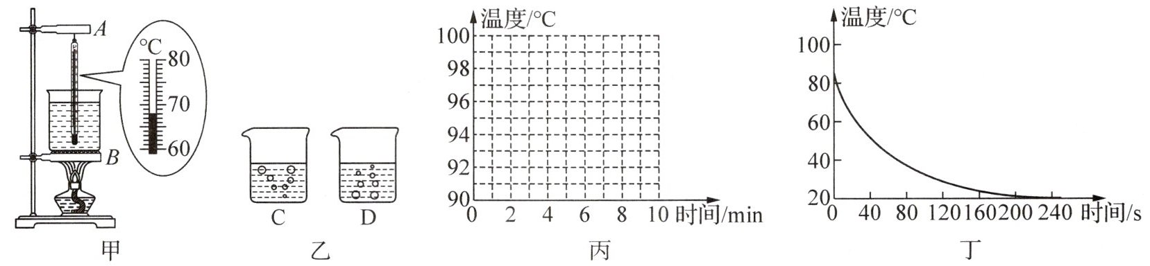 (1) 温度计的玻璃泡需要浸没在待测液体中,与待测液体充分接触,这样测量出的结果比较准确。由图甲可知,温度计的分度值为 $ 1^{\circ}C $,其读数为 $ 68^{\circ}C $。