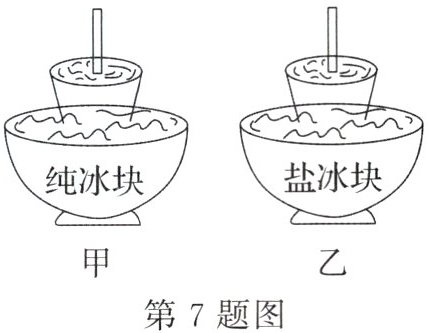 7.(3分)如图所示,甲、乙两同学将两杯相同的西瓜汁分别放在正在熔化的纯冰块和盐冰块中,制作西瓜冰棒,这是利用冰块______(填物态变化名称,下同)吸收热量后西瓜汁______成冰棒,你认为______(选填"甲"或"乙")同学可以成功制作出西瓜冰棒.(已知盐冰块的熔点为-5℃,西瓜汁的凝固点为0℃)