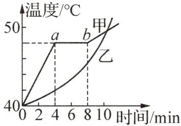 C 解析:晶体有熔点,非晶体没有熔点,由图可知,甲物质熔化过程中,吸收热量,温度不变,是晶体,乙物质熔化过程中,吸收热量,温度升高,是非晶体,故 A 正确;甲物质从第 4 分钟开始熔化,第 8 分钟熔化结束,则第 6 min 时甲物质处于固液共存状态,故 B 正确;在第 4 min 到第 8 min 内,甲、乙物质都吸收热量,故 C 错误;甲物质的熔化温度是 $ 48^{\circ}C $,即熔点是 $ 48^{\circ}C $,乙物质是非晶体,没有熔点,故 D 正确。