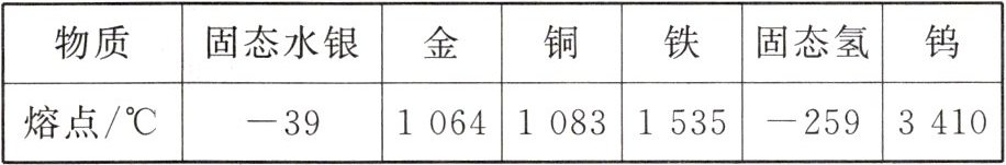 D 解析:由表可知,固态氢的熔点为 $ -259^{\circ}C $,则 $ -259^{\circ}C $ 的氢可能是固态、液态或固液共存状态,故 A 错误;由表可知,金的熔点为 $ 1064^{\circ}C $,铜的熔点为 $ 1083^{\circ}C $,纯金水的温度可能低于、等于或高于铜的熔点,所以铜块掉入纯金水中,可能会熔化,故 B 错误;由表可知,铁的熔点为 $ 1535^{\circ}C $,钨的熔点为 $ 3410^{\circ}C $,钨的熔点更高,则与钨相比,用铁制成的灯丝更易熔化,故 C 错误;由表可知,水银的熔点为 $ -39^{\circ}C $,即凝固点为 $ -39^{\circ}C $,处于 $ -53^{\circ}C $ 的环境中时,温度计中的水银会凝固,这种温度计是根据液态水银热胀冷缩的性质制成的,水银凝固后,温度计将无法使用,故 D 正确。