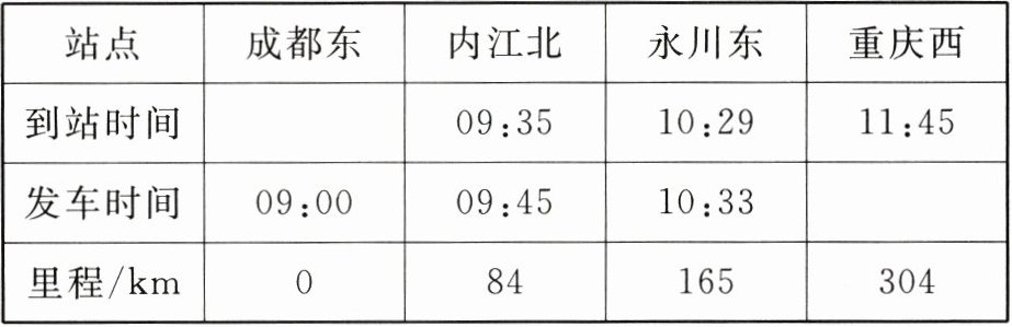 (2)由表中数据可知,内江北到重庆西的路程$s = 304km - 84km = 220km$,则该动车从内江北到重庆西的平均速度$v=\frac{s}{t}=\frac{220km}{2h}=110km/h$。