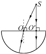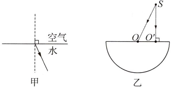 (2)如图乙,光源S发出的两束光射向半圆形玻璃砖,画出这两束光射入玻璃砖的光路图.