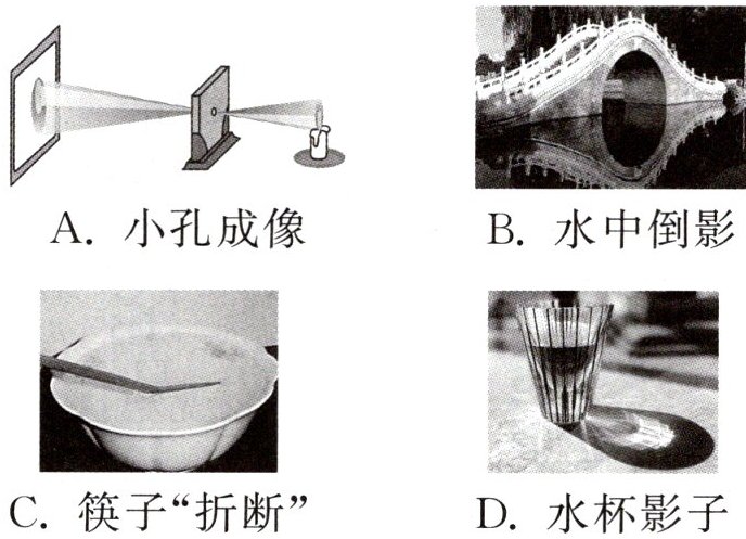 1. 新素养 物理观念 (2024·云南)古代的《墨经》对光现象就有了记载.如图的光现象中,由于光的折射形成的是 ()