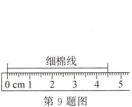 4.50 360 偏小 解析:由图可知,刻度尺的分度值为1 mm,则这段细棉线的长度$L = 4.50 cm$;地图的比例尺为$1:8000000$,则这两市间高铁路线的实际里程$s = 8000000L = 8000000×4.50 cm = 3.6×10^{7} cm = 360 km$;若测量时细棉线没有拉直,所测棉线的长度偏小,则测量结果会偏小.