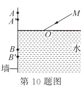 10. 小云同学用一支新买的激光笔照射水平水面,在竖直白墙上出现了两个红色亮点A和B,如图所示.现保持入射点O的位置不变,欲使亮点A下移至A'处,应使入射光线MO绕着点O沿______方向转动;现保持入射点O的位置不变,欲使亮点B下移至B'处,应使入射光线MO绕着点O沿______方向转动.(均选填“顺时针”或“逆时针”)