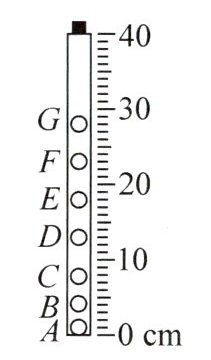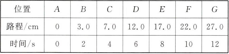 解析:(1)气泡在 $ AG $ 段的路程 $ s = 27.0\ \text{cm} = 0.27\ \text{m} $,时间 $ t = 12\ \text{s} $,则气泡在 $ AG $ 段的平均速度 $ v = \frac{s}{t} = \frac{0.27\ \text{m}}{12\ \text{s}} = 0.0225\ \text{m/s} $。
