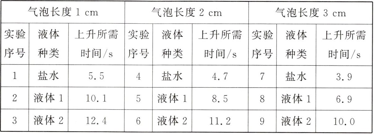 ①分析____三组实验数据,可以得出实验结论:液体黏度相同,气泡长度越长,气泡运动越____(选填"快"或"慢");