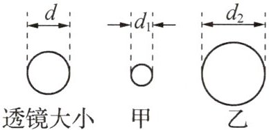 凸 凸透镜对光有会聚作用 可能 解析:太阳光经过透镜后在纸上形成光斑甲和乙,由图知 $ d_{1} \lt d $,即甲光斑的直径小于透镜的直径,说明太阳光经过透镜后发生了会聚,所以形成甲光斑的是凸透镜. $ d_{2} \gt d $,即乙光斑的直径大于透镜的直径,若形成乙光斑的透镜是凸透镜,且透镜与纸片的距离大于透镜的二倍焦距,透镜远离纸片时,光斑比透镜大且会一直变大;若形成乙光斑的透镜是凹透镜,透镜远离纸片,光斑也会一直变大.所以形成乙光斑的透镜可能是凹透镜.