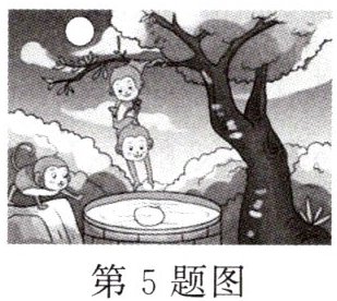 5. 我国四大名著《西游记》中有一段悟空拜师学艺时与祖师的一段对话.祖师说:“如想长生,却如同‘水中捞月’.”悟空问:“怎么叫作‘水中捞月’?”祖师说:“月亮在天空中,水中只有月亮的影子,虽然看得见,只是无法去捞,到底只能是空想罢了.”如图所示,水中的月亮是由光的______(选填“反射”或“折射”)形成的______像,所以猴子捞不到,此时水中的月亮到水面的距离______(选填“大于”“小于”或“等于”)水的深度.