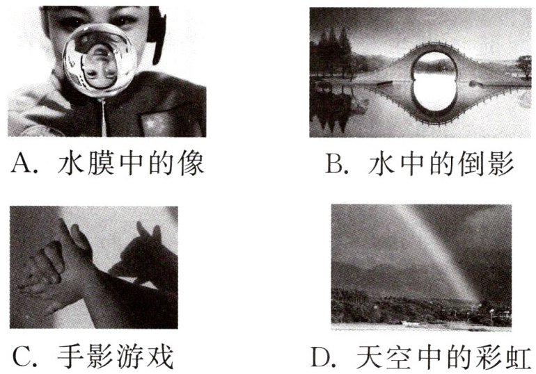 2. (2024·四川广安)“以铜为镜,可以正衣冠”,我们的祖先很早就会利用磨光的铜镜来观察自己的像.下列图示现象与铜镜成像原理相同的是()