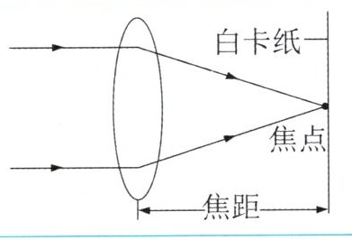 ②测焦距:测定凸透镜的焦距才能决定镜筒的长度.将凸透镜正对太阳,另一侧放白卡纸,太阳光平行入射后会聚在焦点,用白卡纸找到此焦点,测出焦距.
