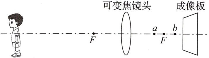 $b$ 能 解析:当人远离镜头时,物距变大,像距变小,为使像还能成在成像板上,就要使透镜对光的会聚能力减小,即透镜的焦距要变大,故此时透镜的焦点变为$b$点.保持人与镜头的位置不变,无论是否有成像板,人都能够通过凸透镜成实像.