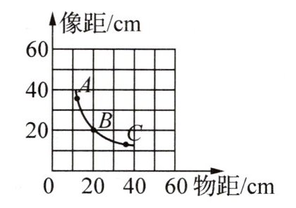 6. (2025·重庆期中)在探究凸透镜成像的规律实验中,某小组同学将实验测量的多组物距、像距数据绘成了如图所示的图像,图线中A、B、C三点代表了实验中蜡烛在光具座上的三个位置.当蜡烛处于A点时,成倒立、______的实像;当蜡烛从B移动到C的过程中,所成的像逐渐______(选填“变大”或“变小”).