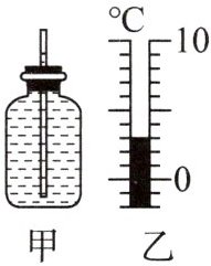 7. 如图甲所示是小明自制的液体温度计,瓶中装满红颜色的水. 将瓶放入热水中,瓶中水柱会____(选填“上升”或“下降”);为了使水柱高度变化更明显,瓶中的管子应选用____(选填“粗”或“细”)一些的. 图乙中的温度计示数是____$^{\circ}C$.