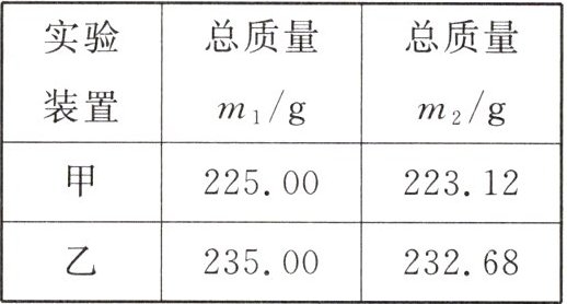(2) ① 分析表中的数据可知,装置甲中透过面料1的水蒸气质量$m_{甲}=m_{1}-m_{2}=225.00g-223.12g=1.88g$.② 装置乙中透过面料2的水蒸气质量$m_{乙}=m_{1}-m_{2}=235.00g-232.68g=2.32g$,相同的时间内,透过面料2的水蒸气质量比较大,则面料2透水汽性更大.③ 两种面料透过水蒸气的质量之差$\Delta m=m_{乙}-m_{甲}=2.32g-1.88g=0.44g$,则两种面料的透水汽性之差$\frac {Δm}{St}=\frac {0.44×10^{3}mg}{40cm^{2}×\frac {30}{60}h}=22mg/(cm^{2}\cdot h)$.