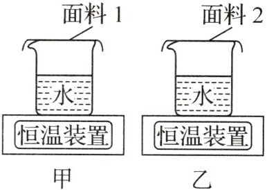 13. (2024·广东)鞋子面料的透水汽性会影响脚的舒适感.透水汽性是指单位时间内透过单位面积的水蒸气质量.为比较两款鞋子面料的透水汽性,小明用如图所示的两个装置进行实验.在相同规格的容器中盛放等质量的水,用恒温装置维持水温不变,面料与容器口紧密贴合.容器口的面积为$40cm^2,$装置甲中的水温为37℃,实验室温度为23℃.