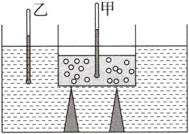 9. (2025·江苏苏州期中)如图所示,在气温为 $ 0 ^ { \circ } \mathrm { C } $的时候,用一个小金属盆装冰水混合物,并置于装 $ 0 ^ { \circ } \mathrm { C } $的酒精大盆中.在两盆液体中分别插一支温度计甲和乙,用电风扇吹液面时,内盆仍是冰水混合物,外盆仍有许多酒精.在此过程中 ()