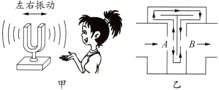 科学研究发现,音叉的叉股向外侧振动时,会压缩外侧邻近的空气,使这部分空气变密;叉股向内侧振动时,这部分空气又变疏……随着音叉的不断振动,空气中的声波由近处向远处传播.当两列频率相近的声波相遇时,如果其中一列声波的“密部”与另一列声波的“疏部”恰好相遇,它们就会相互抵消,在这些位置几乎听不到声音.根据这个原理,科学家研发出一种消声器,它对特定频率的声音具有较好的消声效果.图乙是这种消声器的结构原理图,一列声波,沿水平管道自左向右传播,当入射声波到达 A 处时,分成两束声波,它们分别向上、向下沿图中箭头所示的方向传播,通过不同的路径在 B 处再次相遇,恰好发生消声现象.