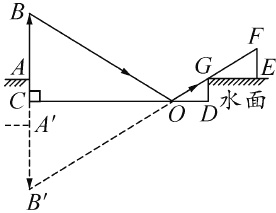 12.B 解析:当人退到距岸边6m的位置时,电线杆顶部的像与人眼处的连线刚好过河岸,人再后退就看不到电线杆顶部的像了.由题意作出如下示意图,AB是电线杆、A'B'是电线杆的像、CD是水面、F点是人眼的位置,由数学知识可知$\frac{CO}{CB'}=\frac{OD}{GD}=\frac{GE}{FE}$,$GE = 6m$、$FE = 1.5m$、$GD = 1m$,解得$OD = 4m$,则$CO = 40m - 4m = 36m$,又因为$\frac{CO}{CB'}=\frac{OD}{GD}=\frac{4m}{1m}=4$,所以$CB'=\frac{1}{4}CO=\frac{1}{4}\times36m = 9m$,则电线杆高$AB = CB - CA = CB' - CA = 9m - 1m = 8m$,故B正确.