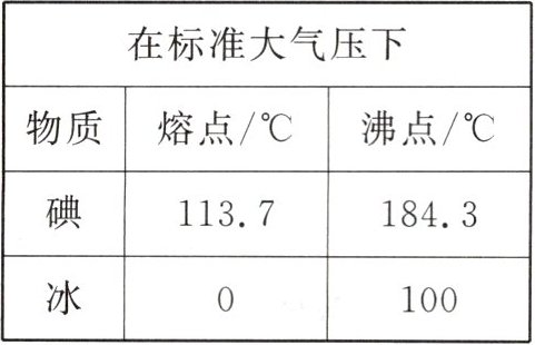 (2)小明猜想碘是先由固态迅速变为液态,再由液态迅速变为气态,因为变化的速度太快,液态碘出现的时间太短,因而没有被观察到.请你根据如表提供的信息分析,小明的猜想是____(选填“正确”或“错误”)的.