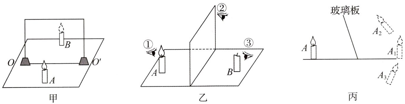 (3) 由于像与物关于镜面对称, 所以如果玻璃板没有与水平面垂直, 而是如图丙所示倾斜, 则蜡烛 $ A $ 的像在图中的 $ A_{2} $ 处. 小轿车前挡风玻璃是倾斜的, 汽车内物体的像成在汽车的前上方, 司机看前方道路时, 物体的像不会影响司机的视线.