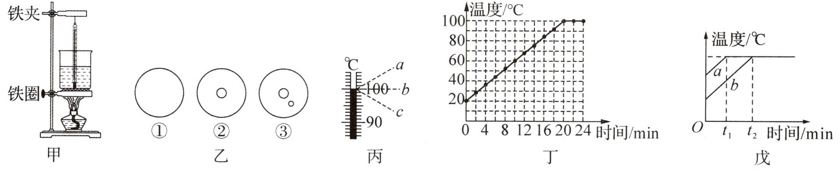 (1)秒表 (2)需要 确保实验中用酒精灯的外焰加热 将铁夹向上调节 (3)③ (4)b $100^{\circ}C$ (5)液化 放出 水银 (6)持续升高 保持不变 (7)减少水的质量 (8)水的初温不同 (9)撤去酒精灯,停止加热 烧杯中的水能继续从石棉网吸收热量 (10)液化 受冷收缩 汽化 (11)97 不沸腾 快 (12)能 纸的着火点高于水的沸点 (13)调为小火 (14)抽气 沸点温度 沸点随气压降低而降低 (15)D 解析:(5)物质由气态转变为液态的过程叫液化,因此烧杯上方出现的大量“白气”是水蒸气液化形成的,该过程放出热量。从表格中可以看出,在标准大气压下,水银的凝固点是$-38.8^{\circ}C$、沸点是$357^{\circ}C$,酒精的凝固点是$-117^{\circ}C$、沸点是$78.5^{\circ}C$,乙醚的凝固点是$-114^{\circ}C$、沸点是$35^{\circ}C$,由于实验时水的沸点是$100^{\circ}C$,所以应该选水银作为测温物质。(6)根据图丁进行分析,水在沸腾前,吸收热量,温度持续升高;水在沸腾时,吸收热量,温度保持不变。(7)由图丁可知,小明实验中加热到沸腾所用的时间太长,因此可以通过减少水的质量从而缩短加热到沸腾所需的时间。(8)由图戊可知,a、b水的升温快慢相同,说明水的质量相同,a的初始温度高于b的初始温度,因此造成图像不同的原因是水的初温不同。(9)水在沸腾过程中需要吸收热量,为了验证这一结论,需要进行的操作是撤去酒精灯,停止加热,观察水是否继续沸腾;进行了该操作后,烧杯中的水没有立即停止沸腾,其原因可能是石棉网的温度高于水的沸点,水能继续从石棉网吸收热量,满足水沸腾的条件。(10)沸腾前水中的气泡在上升过程中越来越小,主要原因之一是气泡内的水蒸气在上升途中遇冷液化成水,使得气泡体积变小;另外一个主要原因是气泡在上升过程中,遇到上方温度较低的水而受冷收缩,使得气泡体积变小。沸腾后水中的气泡在上升过程中越来越大,主要原因之一是气泡边缘的水在上升途中不断汽化成水蒸气,进入气泡内,使得气泡体积变大。(11)由图A可知,温度计的分度值为$1^{\circ}C$,则其读数为$97^{\circ}C$;由(4)知水的沸点为$100^{\circ}C$,则试管中的水没有达到沸点,所以不沸腾。试管中水的温度不再变化的主要原因是试管中水温较高时,水的蒸发变快,相同时间内试管中的水从沸水中吸收的热量几乎等于试管中的水蒸发吸收的热量。(12)用纸锅烧水,虽然火焰温度约为$600^{\circ}C$,远大于纸的着火点$183^{\circ}C$,但是水在通常情况下的沸点为$100^{\circ}C$,当水沸腾时,虽然继续吸收热量,但温度保持$100^{\circ}C$不变,纸锅内的温度保持在$100^{\circ}C$,达不到纸的着火点,纸锅不会烧着,所以他能完成实验。(13)水沸腾后继续加热,温度保持不变,用炉火炖牛肉时,在沸腾后调为小火,维持沸腾状态,可以节省燃料。(14)当试管内水沸腾后,停止加热,用气筒向外抽气,水再次沸腾时,记录下沸点温度。多次这样操作,发现随着水面气压逐步降低,水的沸点逐步降低,则可得出结论:水的沸点随气压降低而降低。(15)水沸腾之后,温度保持不变,当向锅里迅速加了一大碗水后,锅内水的温度快速下降,继续加热,水吸热温度上升,由于水量变多,水升温速度变慢,达到沸点后再次沸腾,由于水面上的气压不变,所以水的沸点与原来相同。故D图像符合题意。