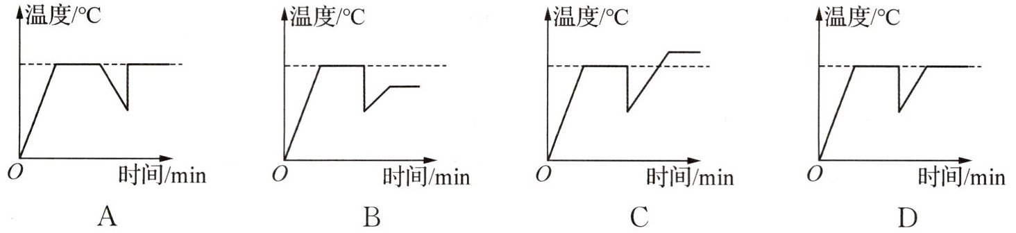 (15) 星期天小亮在家烧水煮饺子,当水烧开准备下饺子时,妈妈提醒他锅里的水有点少,于是小亮又往锅里迅速加了一大碗水(水量比锅里少),用同样大的火直至将水再次烧开.下面能说明其整个烧水过程中温度随时间变化的图像是____(填字母).