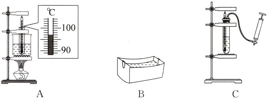 (14) 延伸探究 为研究沸点与气压的关系,用抽气、打气两用气筒、橡皮塞等组装成如图C所示装置.用气筒____(选填“抽气”或“打气”),观察到水再次沸腾,记录此时的____,多次实验可得出的结论是____.