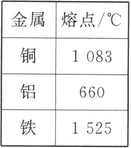凝固 铁 解析:将液态金属灌入模具内,待液态金属凝固后取出,即可得金属钱币.若要复刻铸造纯铜钱币,模具熔点必须高于铜的熔点,由表中数据可知,铁的熔点较高,因此应选择铁制作“钱范”模具.