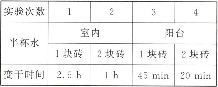 7. 新素养 科学探究 小明发现妈妈拖过的地面很快就干了,而地面瓷砖是不吸水的.为探究“水的消失”与哪些因素有关,小明用同样的半杯水,分别泼洒在凉爽的室内与有光照的封闭阳台上的一块或两块瓷砖上,记录地面变干的时间如下表(瓷砖的大小均相同).