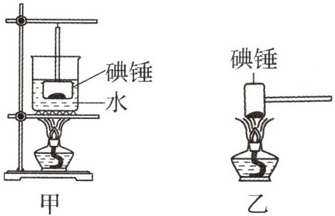 升华 熔化 凝华 放 解析:图甲中采用水浴法加热,碘颗粒的温度最高达到水的沸点,低于碘的熔点,所以碘颗粒吸热会升华为碘蒸气;图乙中采用酒精灯加热,酒精灯外焰的温度约为 $800^{\circ}C$,高于碘的熔点,所以碘颗粒吸热除了升华为碘蒸气外,还可能熔化为液态碘;两种方式停止加热后,“碘锤”中的碘蒸气会放热,凝华为固态的碘颗粒.