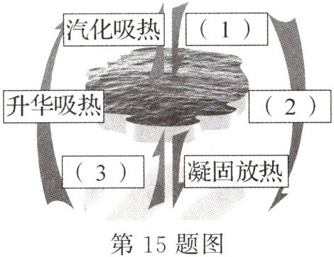 15. 在自然界的水循环中,水的状态可以发生多种变化,并在状态变化时吸热或放热,小虎在归纳水循环示意图时忘了三个地方没有写全,请你帮他按已整理的格式补充完整.(1)______、(2)______、(3)______;其中要完全实现第(3)种状态变化,需要满足的条件是:①______、②______.