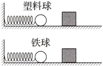 相同 相同 不能 解析:用形状相同的塑料球和铁球将弹簧压缩到相同程度,弹簧的弹性势能相同,转化成的两球的动能相同,则木块被推开的距离相同;两球获得的动能相同,因为质量不同,所以两球的速度也不同,没有控制变量唯一,该方案不能得出动能跟质量的关系。