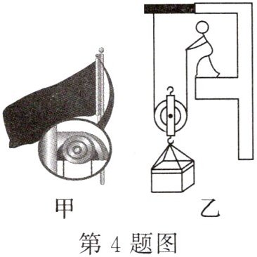 4. (2025·江苏徐州月考)如图甲所示,升旗时旗手在下面拉动绳子,旗子就会上升,这是由于旗杆顶端有一个特殊的装置,它是______(选填“定”或“动”)滑轮,使用它的作用是______;如图乙,工人在阳台上将木箱提升到高处,木箱上方的装置是______(选填“定”或“动”)滑轮,使用它可以______.