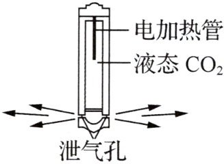 5. 新趋势 学科融合 (2025·湖北黄石期末·2分)二氧化碳($CO_{2}$)爆破技术是现代工程建设中非常环保的技术.起爆前高压泵将$CO_{2}$压缩成高压气体,液化后输入爆破筒内.如图所示,爆破时电加热管发热,使筒内的液态$CO_{2}$迅速汽化,形成的高压气体从泄气孔中喷出,实施爆破.下列说法正确的是 ()