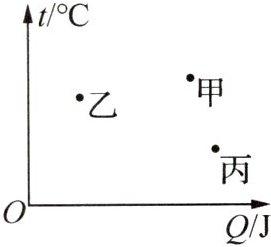 3. (2025·天津期末·2分)现有甲、乙、丙三种初温相同的液体,其中甲、乙为质量不等的同种液体,乙、丙为质量相等的不同液体.对这三种液体分别加热,可根据它们吸收的热量和升高的温度在“温度-热量”图像上分别画出对应的三点甲、乙、丙,如图所示,则甲、丙两种液体的比热容$c_{甲}$____$c_{丙}$;甲、丙两种液体的质量$m_{甲}$____$m_{丙}$.(均选填“>”“=”或“<”)