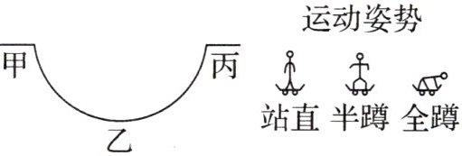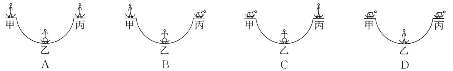 3. (2025·江苏镇江期中·2分)在杭州亚运会滑板女子街式决赛中,年仅13岁的中国小将崔宸曦夺得金牌.如图是U形滑台和运动员姿势的简化示意图,运动员在滑台甲处由静止自由下滑,不计滑台摩擦和空气阻力,仅依靠滑行过程中运动员姿势的自然(不用力)变化,下列图中不可能滑到滑台丙处的是 ()