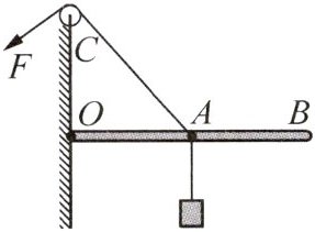 6. 如图所示,长 1 m、重 5 N 的杠杆 OB 连接在竖直墙壁的 O 点上,在杠杆的中点 A 处悬挂 45 N 的重物,固定在 A 点的绳子跨过定滑轮,在拉力 F 的作用下使杠杆在水平位置平衡,此时∠OAC = 45°. 不计绳子的重力和转动部分的摩擦,求缓慢地将杠杆从水平位置转动到竖直位置的过程中,拉力做的功.
