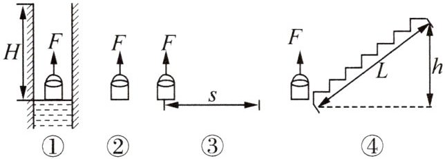 2. (2024·安徽六安模拟)如图所示,用力提水桶:① 由井底提升高度 H;② 不动;③ 在水平面上移动一段距离 s;④ 爬上长为 L、高为 h 的楼梯. 上述四种情况中,力 F 对水桶做功的是 ()