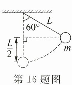 16. 如图所示,长L= 80cm的细绳上端固定,下端系一个质量m= 100g的小球,将小球拉起至细绳与竖直方向成60°角的位置,然后由静止释放,不计空气阻力,则小球摆到最低点时,重力做功____J,绳子的拉力做功____J。(g取10N/kg)