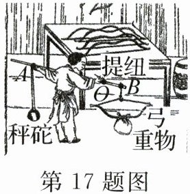 17. $ 450 $ 远离 解析:杆秤平衡时,由杠杆的平衡条件可得 $ G_{\text{砣}} \times AO = F \times BO $,则弓弦所受的拉力 $ F = G_{\text{砣}} \times \frac{AO}{BO} = 150 \, \text{N} \times \frac{3}{1} = 450 \, \text{N} $;为测出弓弩的最大弹力,逐渐增加弓弦下方所挂重物的重力,则 $ F $ 变大, $ G_{\text{砣}} $、 $ BO $ 不变,由杠杆的平衡条件可知, $ AO $ 应增大,则应再将秤砣悬挂点逐渐远离 $ O $ 点。